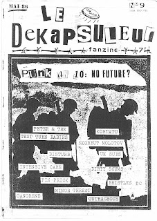 - Le Dekapsuleur nº 9 (mayo del 86): Excelente el contenido, habiendo entrevistas y reportajes de bandas como Peter and The Test Tube Babies, Uk Subs, Intensive Care, Dirty Scums, Minor Threath… y Kortatu. Buena entrevista donde el grupo habla de sus influencias, de algunas canciones, del conflicto vasco, de Decibelios y su “Viento de Libertad”, de la escena española… Incluso viene la dirección personal que en aquella época tenía Fermin! Interesante y destacar también que en el encabezado de la página viene un torero y un Arriba España; Jodidos estereotipos jajaja!!! (evidentemente, no tiene connotaciones fachas, la escena punk francesa está llena de alusiones a la España Republicana que perdió la batalla al fascismo en la Guerra Civil, encontrando numerosos temas con esa temática y otros incluso en castellano, fruto de que allí se estudiaba antes el castellano al igual que aquí el francés y que había mucha gente descendientes de exiliados).